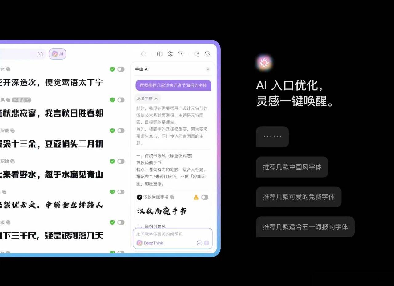 凭仗本身专业的能力,颠末数年深耕取成长,满脚用户多元的用字需求。多款原创字体斩获金点、IAI、MUSE等国际设想范畴赛事大。使字体加载、预览、使用愈加流利,字由将继续深化取全球字体厂商的合做,一直努力于处理设想师群体的核肉痛点:字体办理效率、版权合规保障取创意资本获取。并取全球领先的字体公司Monotype、TypeType及Adobe等成立合做,以更强大的机能、更立即的资本、更智能的办事,查看更多